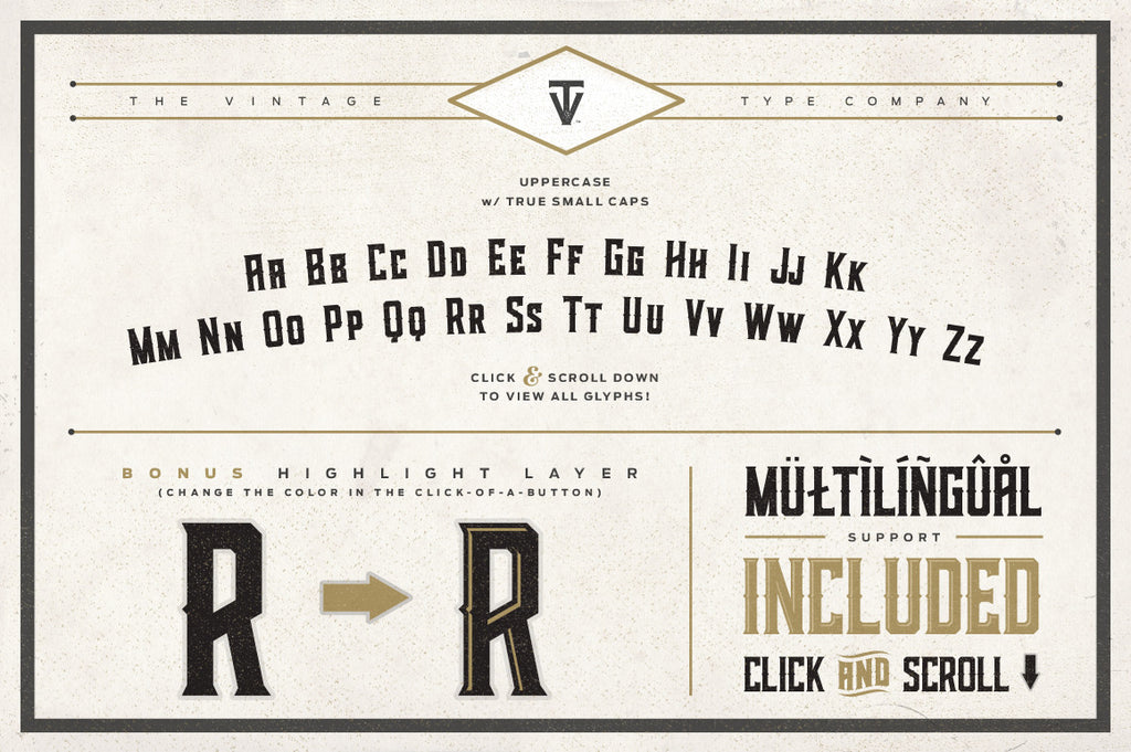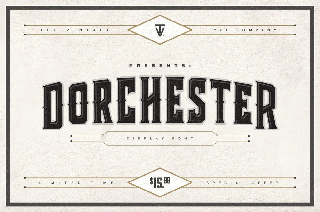 Dorchester display font was inspired by victorian era wood type, and comes included with a bonus highlights style. This font applies itself perfectly to retro & vintage logo design, packaging, posters, t-shirts, cover art, and so much more.